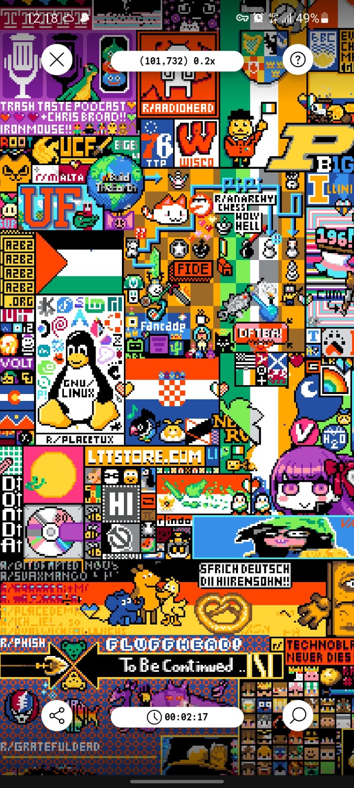 r/place is an online social experiment hosted on Reddit, launched on April Fools’ Day in 2017, and repeated in 2022 and 2023. In this experiment, registered users could edit a digital canvas by placing colored pixels. Each user had to wait a specific time before placing another pixel.