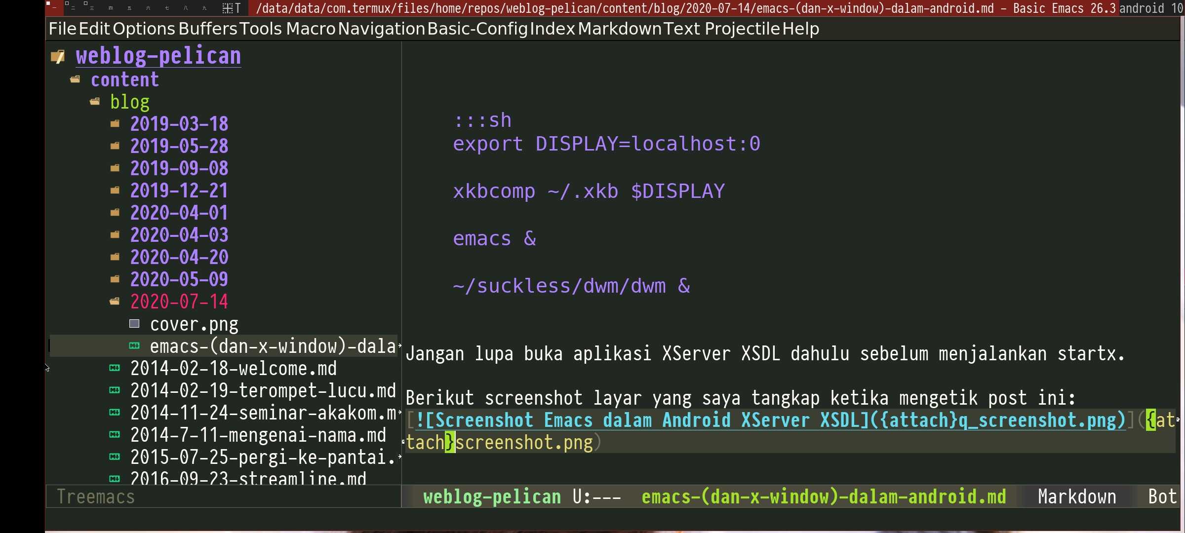 $ pkg install emacs-xSelanjutnya kita butuh Window Manager. Ada beberapa paket WM seperti dvtm, dwm, fluxbox, fvwm,i3, openbox, xfwm4 dan xorg-twm. Karena saya kompilasi sendiri program dwm, saya harus hunting beberapa paket library yang dibutuhkan dari halaman Microsoft Github repo termux-x11.